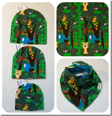 JNY:s underbara djungeljersey har jag spanat in länge och nu finns det i min tyghylla. Jag älskar minen på tigern och de söta aporna som dyker upp här och där!. Till att börja med har jag sytt några mössor och dreglisar . Dreglisarna är fodrade med härligt mjuk polarfleece så de passar bra som värmande scarfar också. De finns i Hantverkarnas butik i Norrtälje.